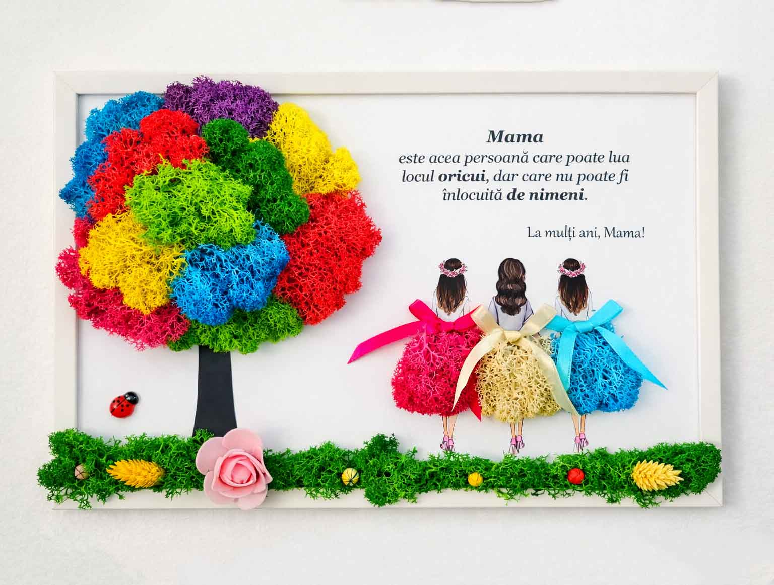 Un cadou pentru mama de ziua ei sau de 8 Martie, personalizat in functie de preferintele tale. Se poate realiza si cu o singura fiica sau cu mai multe. Mesajele si culorile rochitelor se pot modifica. Ne poti contacta pe Whatsapp pentru mai multe detalii.